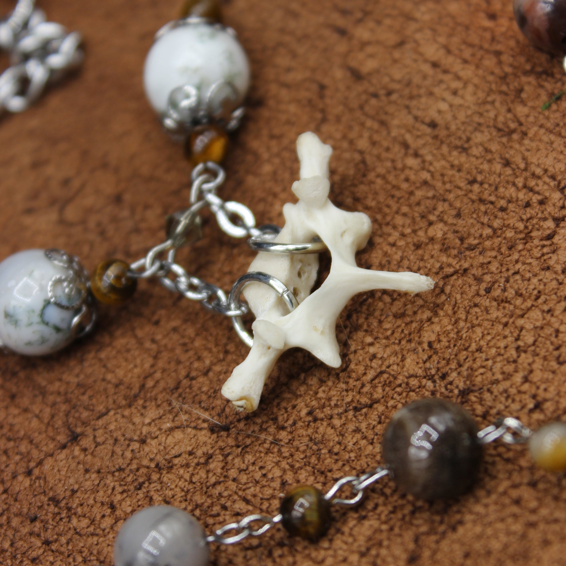 This layered choker combines moss agate, petrified wood, tigers eye, paridot, and glass charms with two groundhog vertebra for an adornment that connects you to your inner will, and Mother Earth. Perfect for ritual wear, festival outfits, or everyday witchy style. Three dramatic layers blend natural stones with stainless steel chain, perfect for alternative fashion styles.